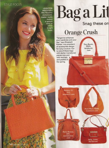 We weren’t the only ones feeling the orange hues this past week! Seems like Life &  Style also have the orange fever, featuring our Ella Hobo in Pulp. The photo included in the LF Layout Features the lovely Leighton Meester on set of Gossip Girls showing orange is the perfect hue for any NY socialite.